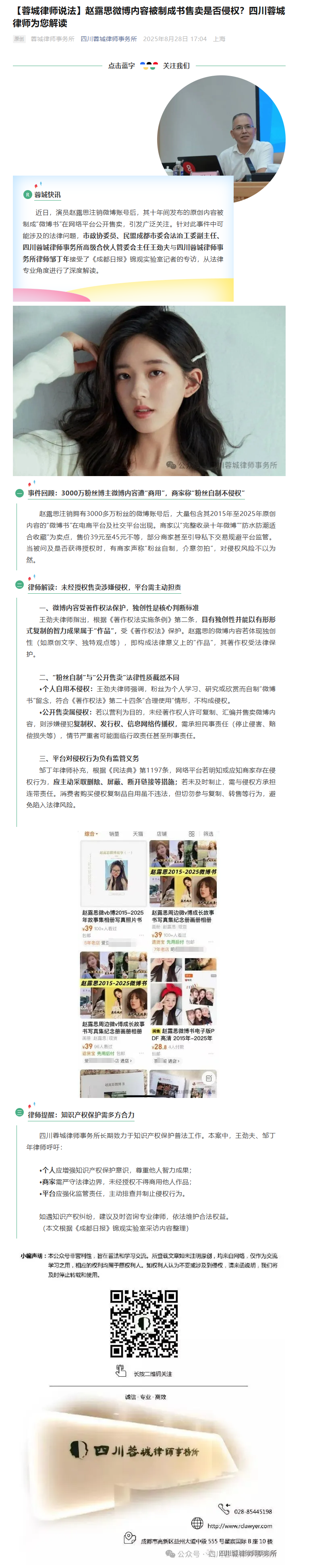 【蓉城律师说法】赵露思微博内容被制成书售卖是否侵权?四川蓉城律师为您解读